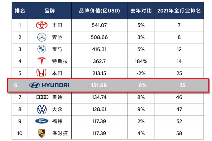 現(xiàn)代汽車位列全品牌排行榜第35位,品牌價值高達152億美元